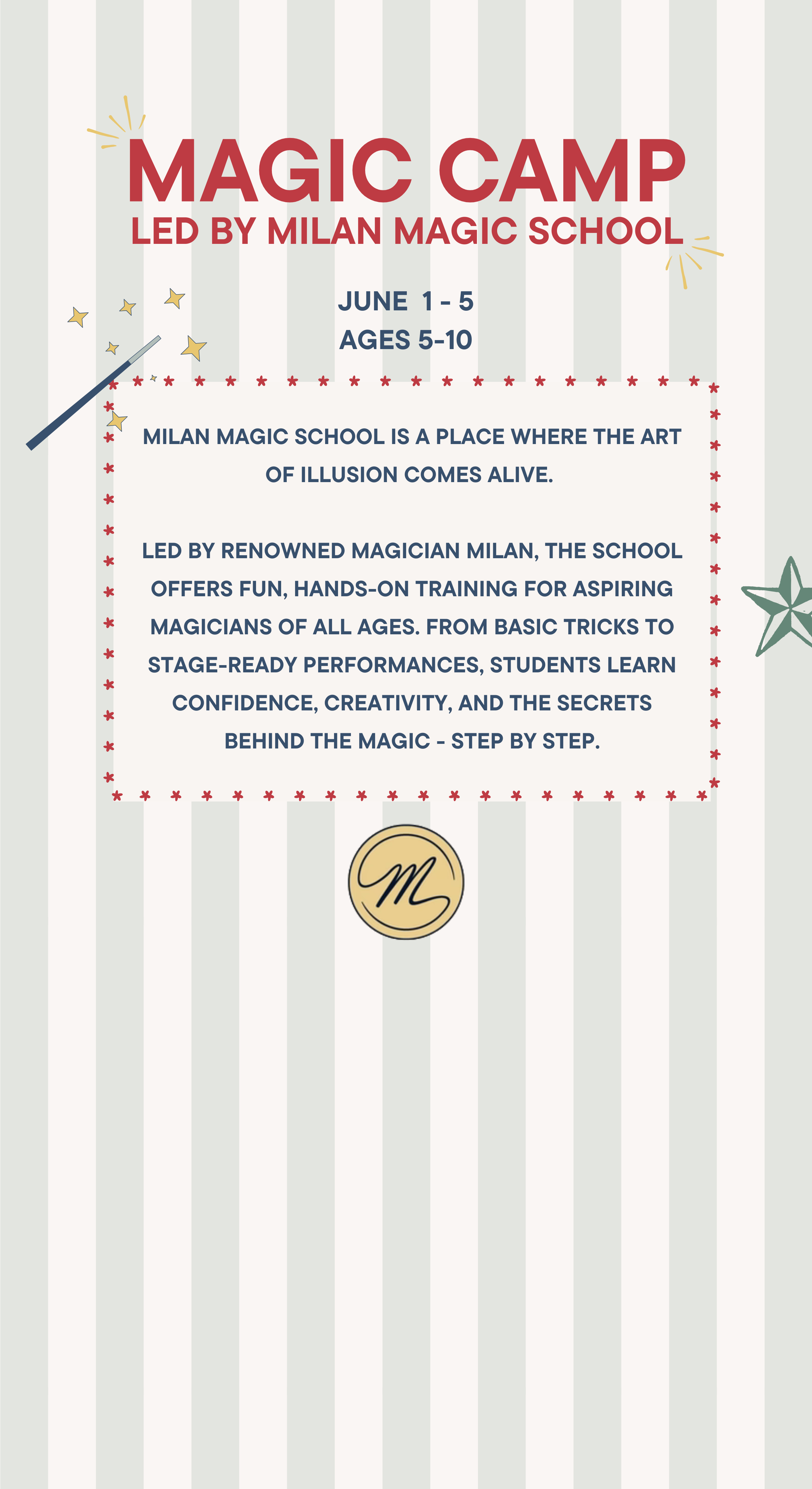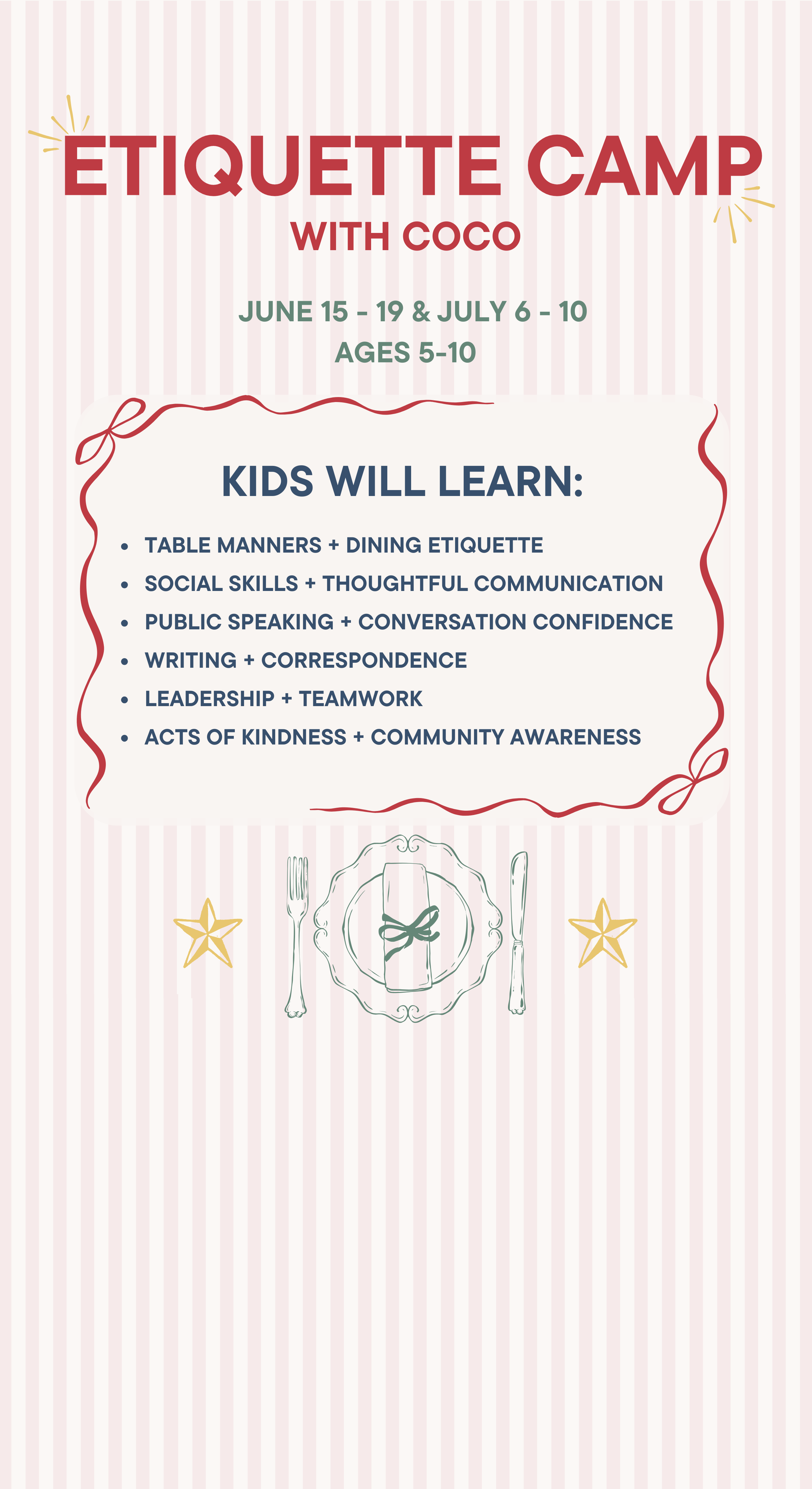 Get ready for a fun-filled, engaging summer at Corals Closet! Our drop-off camp is designed to spark creativity, imagination, and learning through music, art, etiquette, magic, play and movement. Each day follows a structured yet playful schedule to keep kids engaged and excited. See each camp for appropriate ages.